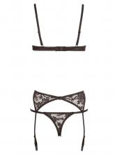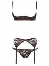 3 Piece floral lace lingerie set including a slightly padded, under-wired self-bra with adjustable shoulder straps, a garter belt with adjustable garter suspenders and 3 position adjustable waist, and a matching open-crotch thong.