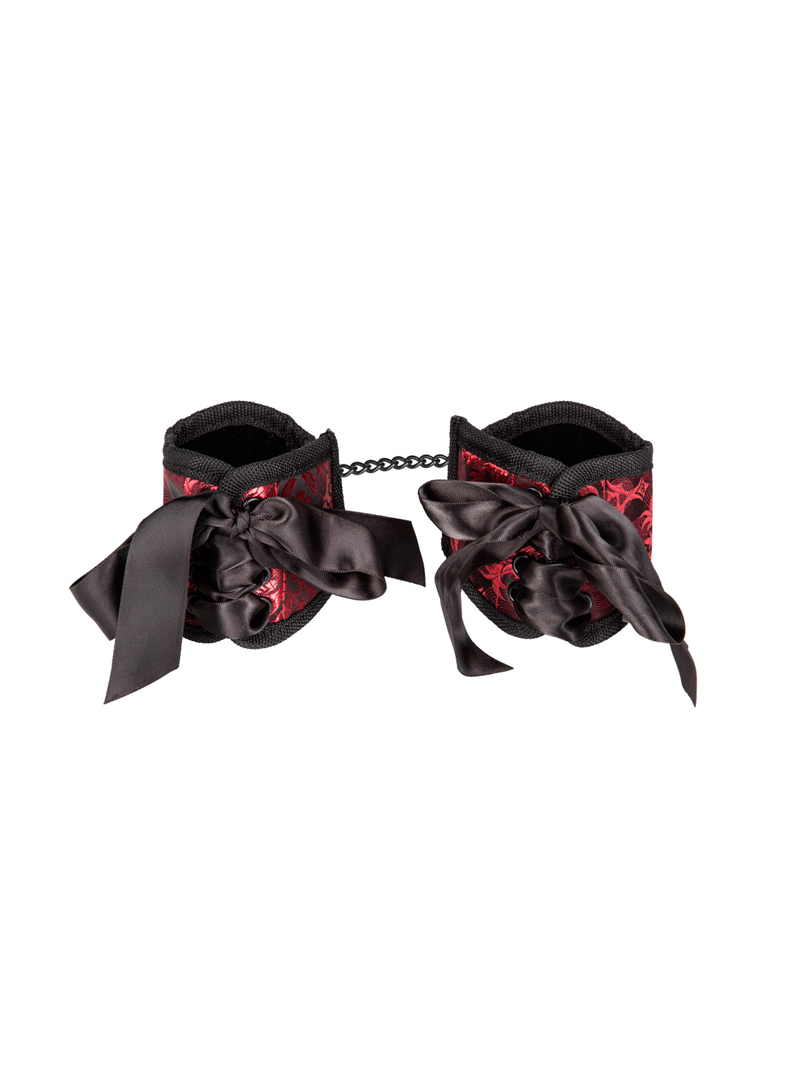 The cuffs are adjustable with Velcro, the inside is soft and are joined by a removable black chain.