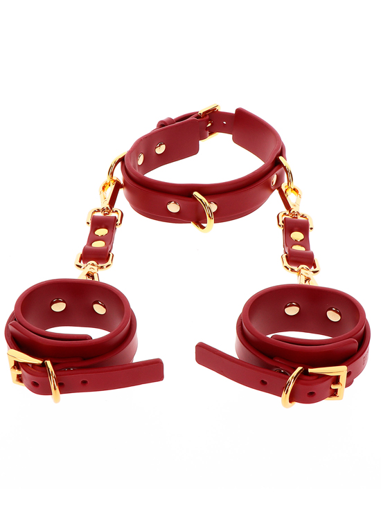 The handcuffs match the collar with beautiful golden hardware, adjust by buckle and also have rings to tie and secure accessories to your liking.