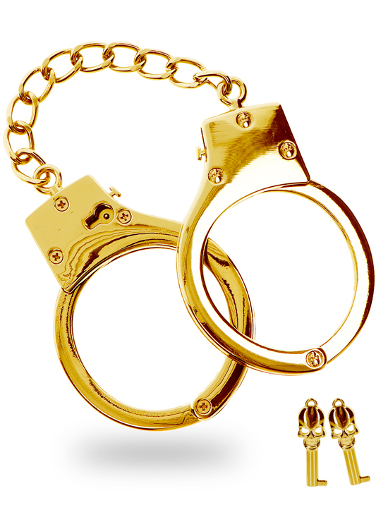 Produced in metal with a golden finish, these mid-range quality handcuffs are quite sturdy and well-finished.
