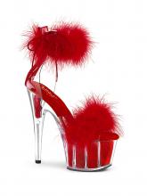 Sandals with transparent platform decorated with feathers on the inside, ankle and front.