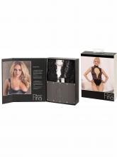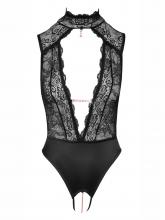 A sensational Body from Abierta Fina in a two-piece design made out of delicate, soft lace and beautiful stretchy satin. Even though it has a rather innocent stand-up collar with buttons, the body is still extremely provocative because of the large cut-outs at the front and back. Other eye-catching details are the small rhinestone pendant on the collar and a sparkling rhinestone chain at the front. The open crotch area with a small, stimulating chain is extremely inviting. The small chain can also be removed.