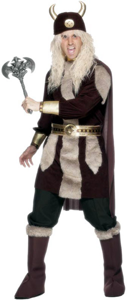 Viking outfit including a tunic with fur applications and cape, a hat with horns, a pair of long shorts and a pair of boot covers.