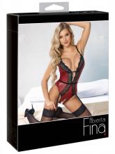 Body Ouvert de Abierta Fina en un noble aspecto mate de peluche rojo con inserciones de encaje negro que realzan la silueta por delante y por detrás. Una banda de cintura firmemente cosida para un énfasis adicional. Escote profundo con tirantes de conexión y 2 cadenas plateadas de purpurina desmontables. La cadena estimulante de la entrepierna abierta también es desmontable, al igual que los tirantes ajustables. En el escote profundo de la espalda 2 tirantes elásticos con cierres de clip. Los tirantes son ajustables.