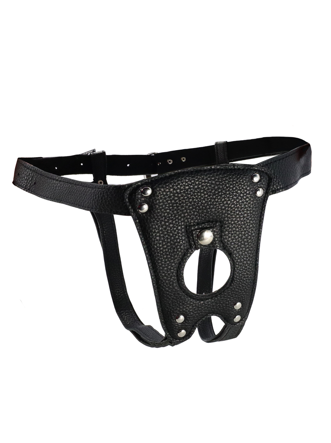 Este slip arnés de piel vegana permite acoplar cualquier vibrador, dildo o enchufe con ventosa de nuestro catálogo.