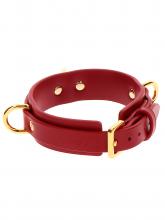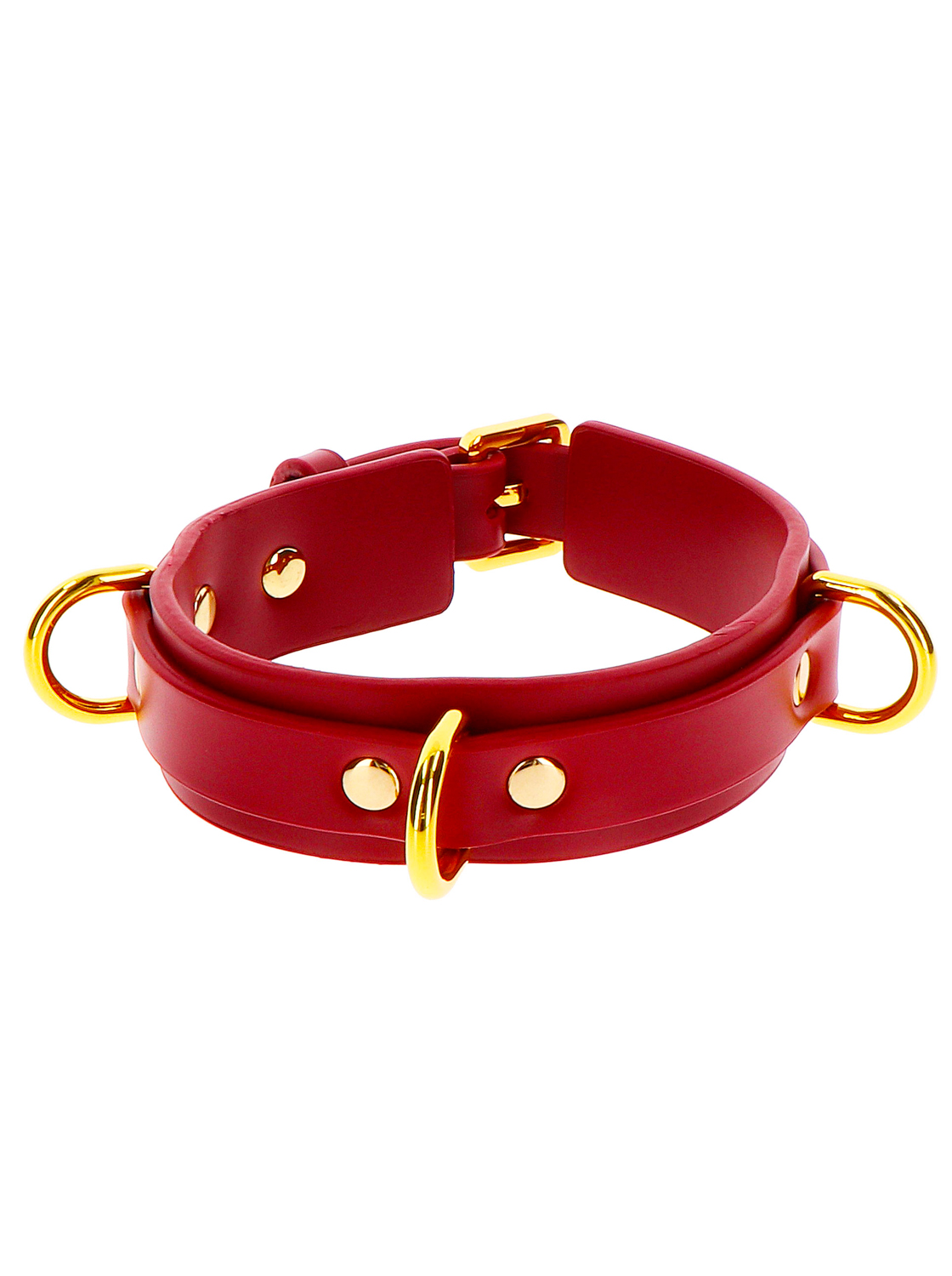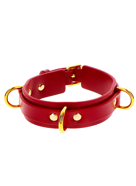 Producido en piel vegana, este precioso y sensual collar mide 3 cm de ancho y tiene 3 aros de forma D para sujetar accesorios, e incluso hebillas doradas para un aspecto aún más refinado y sensual.