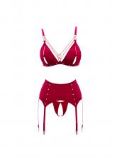 Producido en tejido satinado y compuesto por 3 piezas: sujetador, correa de aleación y tanga.