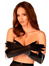 Guantes Milladis, elaborados en tul con adornos de hilos plateados colgantes y sueltos que crean un movimiento de estilo burlesco.
