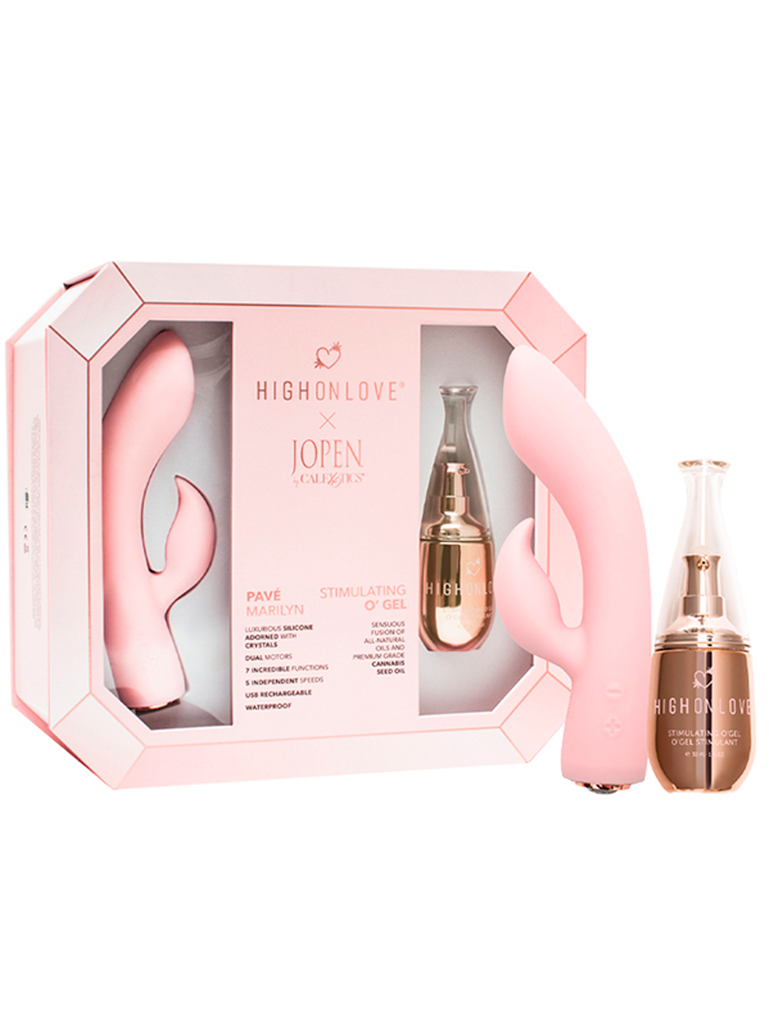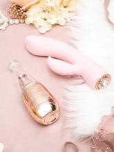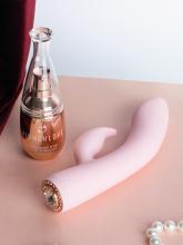 El potente vibrador está fabricado en suave silicona de color rosa, adornado con brillantes envueltos en metal rose gold.