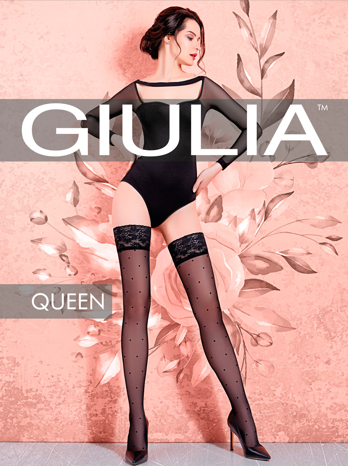 Medias ligas con borde de encaje con patrón floral y patrón con bolitas en la pierna.