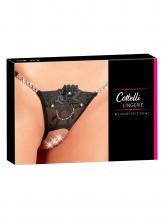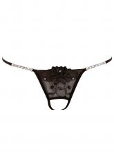 Tanga con abiertura en la ingle. Confeccionada en tela de tul decorada con delicados bordados y adornada con brillo glamoroso.