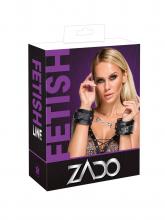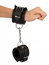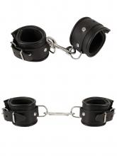Algemas de couro com fivelas de ajuste, interligadas por mosquetão.