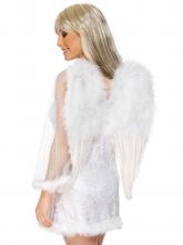 Asas de anjo em penas brancas que fixam às costas com elástico, como uma mochila.