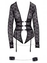 Este body não é apenas bonito; é também funcional e provocante, graças às argolas de metal estrategicamente posicionadas para acoplar algemas ou outros acessórios de soft-bondage. As mangas compridas trazem um toque de elegância, enquanto a abertura na virilha oferece uma dose extra de ousadia para momentos únicos.