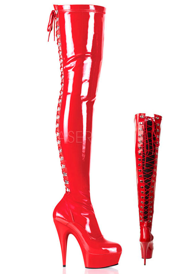 Botas de vinil com plataforma. Cano alto acima do joelho, com cordão atrás.