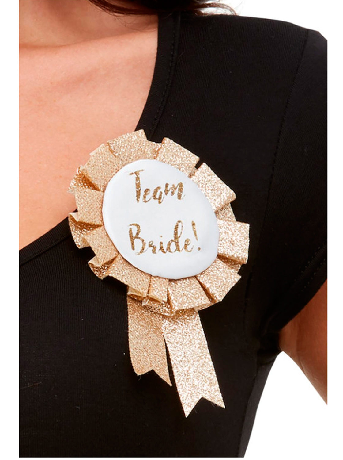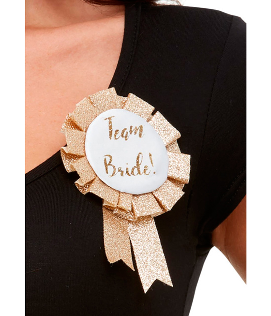 Crachá dourado com brilho para despedidas de solteira, com o dizer em inglês "Team Bride".