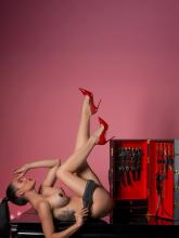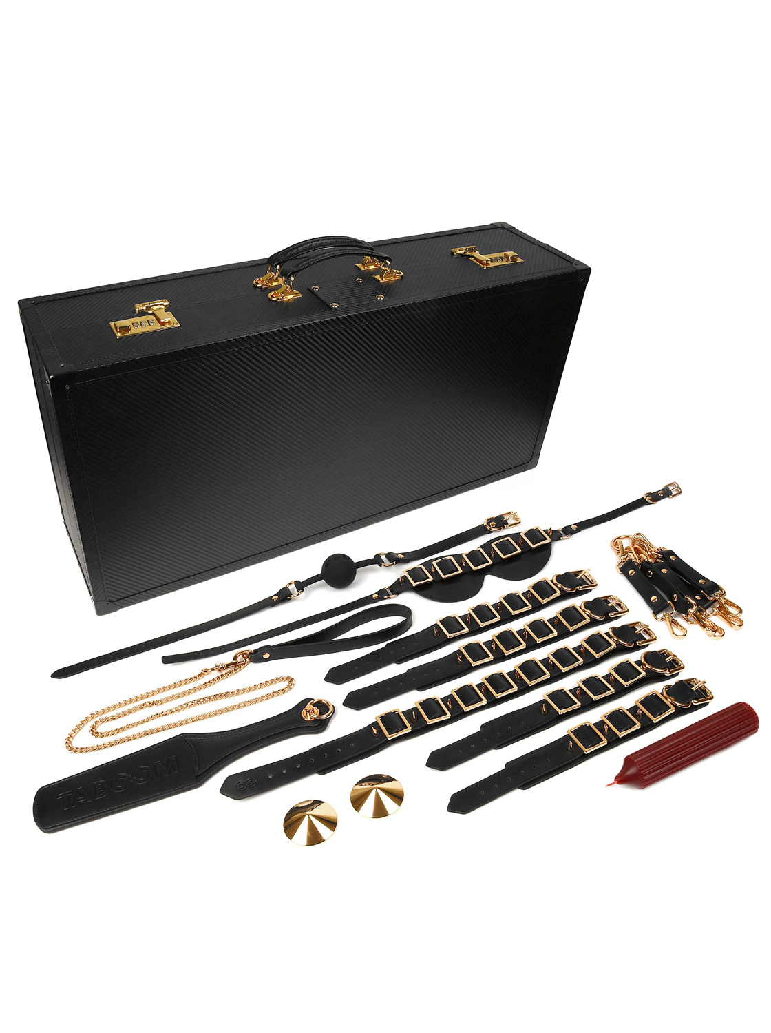 Dentro da mala chamativa, encontrará uma coleira sedutora com trela, algemas elegantes para as mãos e pulsos, uma venda sensual, uma mordaça provocante, um chicote palmatória suave, adesivos de mamilos atraentes e uma vela BDSM para aquecer cada momento.