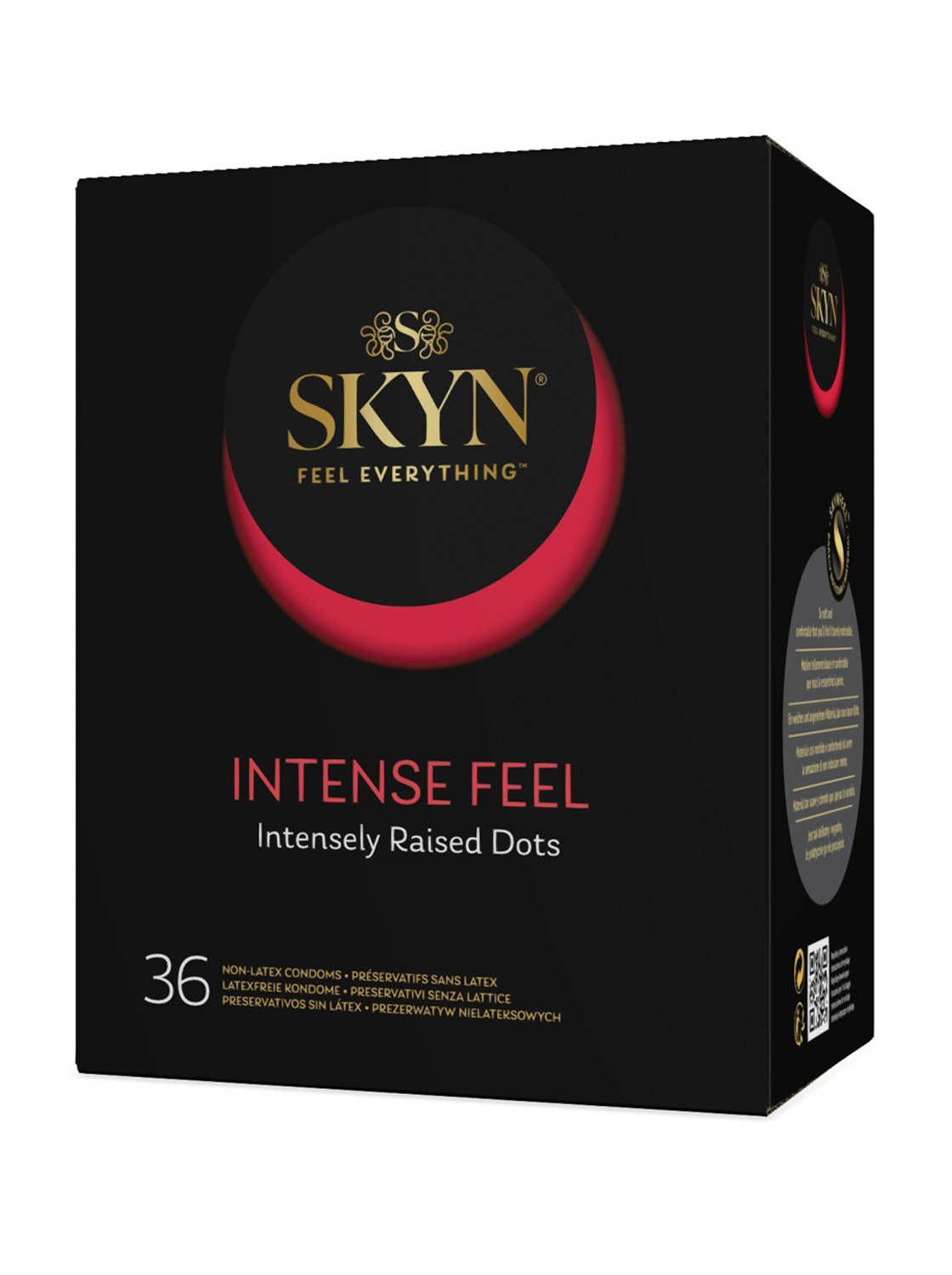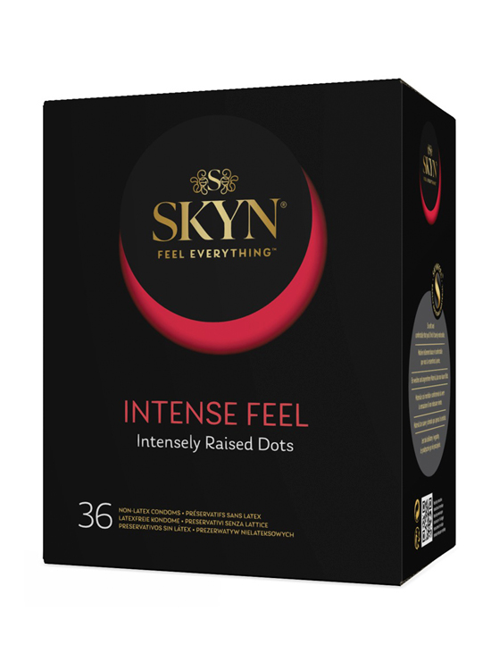 Os preservativos INTENSE FEEL da Skyn são extremamente finos, têm desenho ondulado com nódulos estimuladores salientes nas zonas mais sensíveis para intensificar o prazer, e são cobertos com lubrificante à base de silicone para uma sensação mais real, de pele sobre pele.