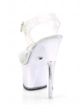 Abertura por fivela no tornozelo. Estas sandálias têm uma plataforma de 7cm e um salto de 17.8cm.