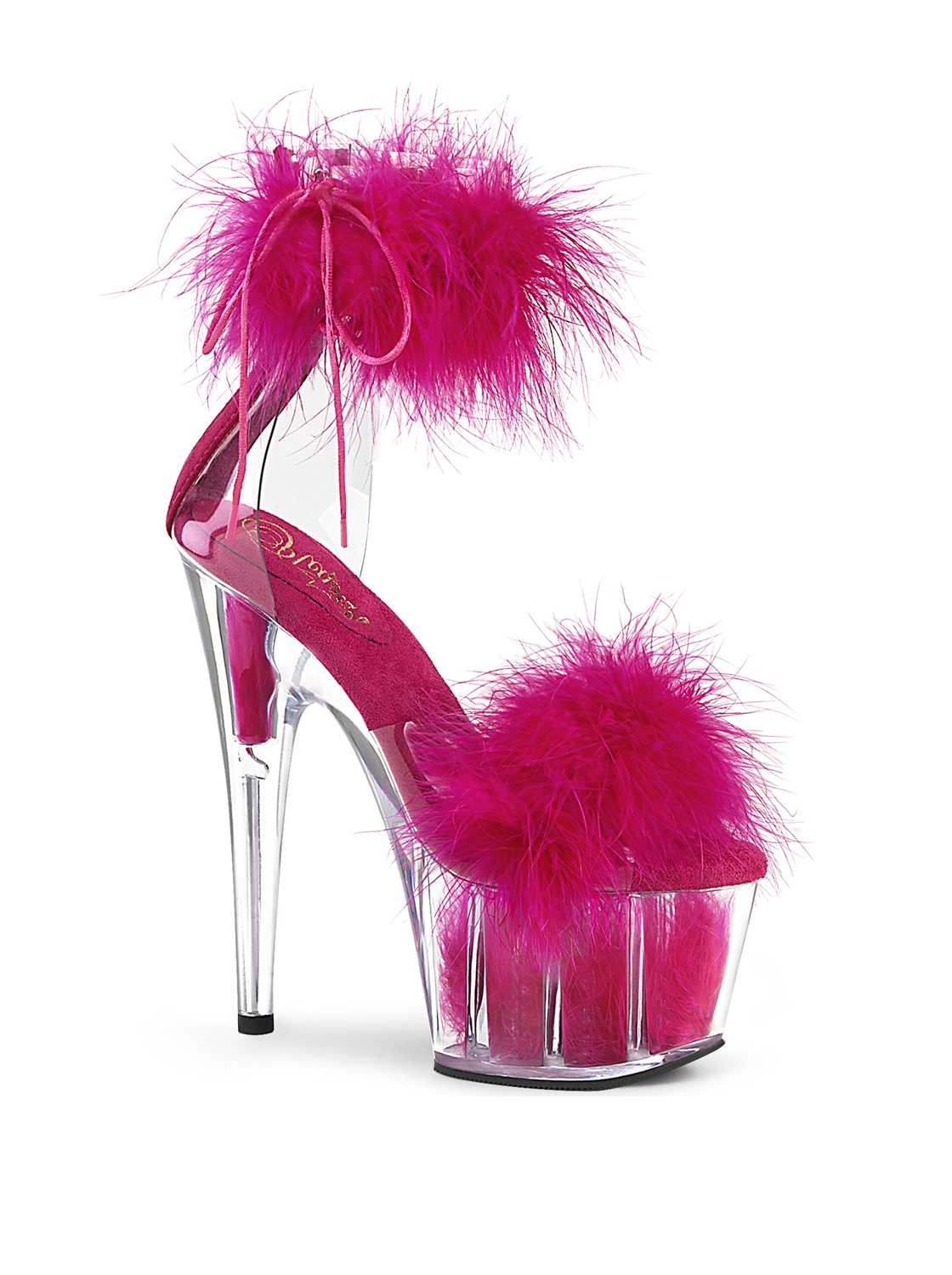 Sandálias com plataforma transparente decorada com plumas no interior, tornozelo e frente.