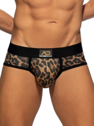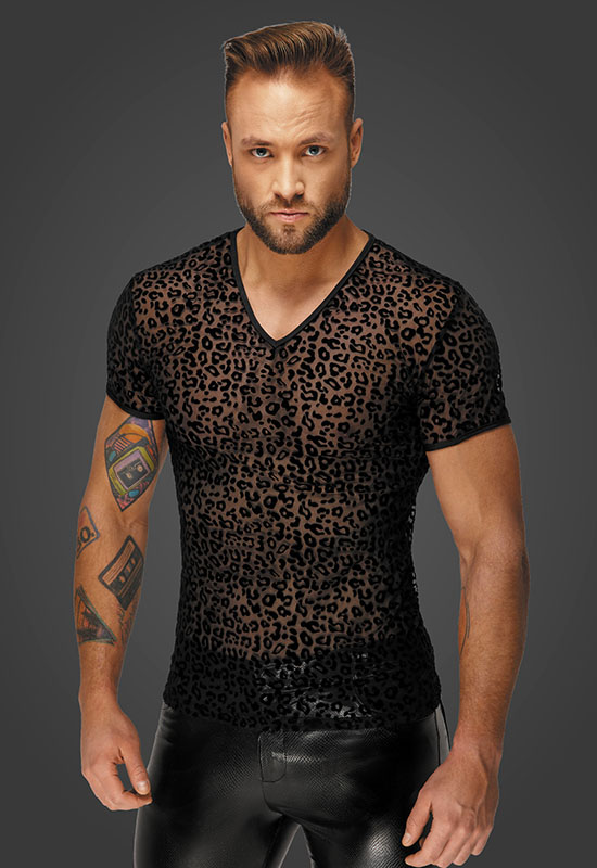 T-shirt para homem, fabricada em tecido tule transparente com padrão leopardo em veludo.